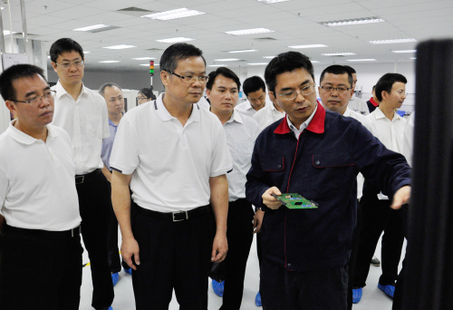 在听取了东莞产业园董事长何在明、总经理高艳关于产业园建设和产业转移情况介绍后,吕业升一行深入考察长城开发生产车间,在自动化产品事业部,东莞产业园公司副总经理、董秘吴鸿彬介绍说,长城开发高度重视智能制造,致力于“自动化减人,机器人换人”,自动化装备能力和解决方案处于制造行业领先水平,吕业升对此表示赞赏,并关切地询问长城开发在该业务领域的发展情况。
