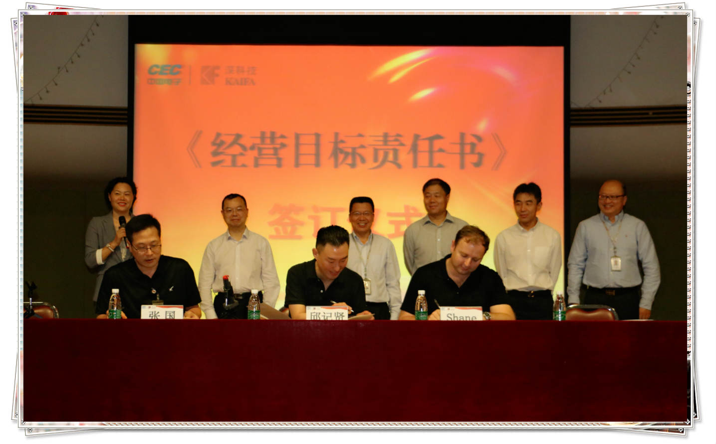 (↓ 邱总与开发微电子总经理张国、封装与测试事业部总经理shane签署经营目标责任书)