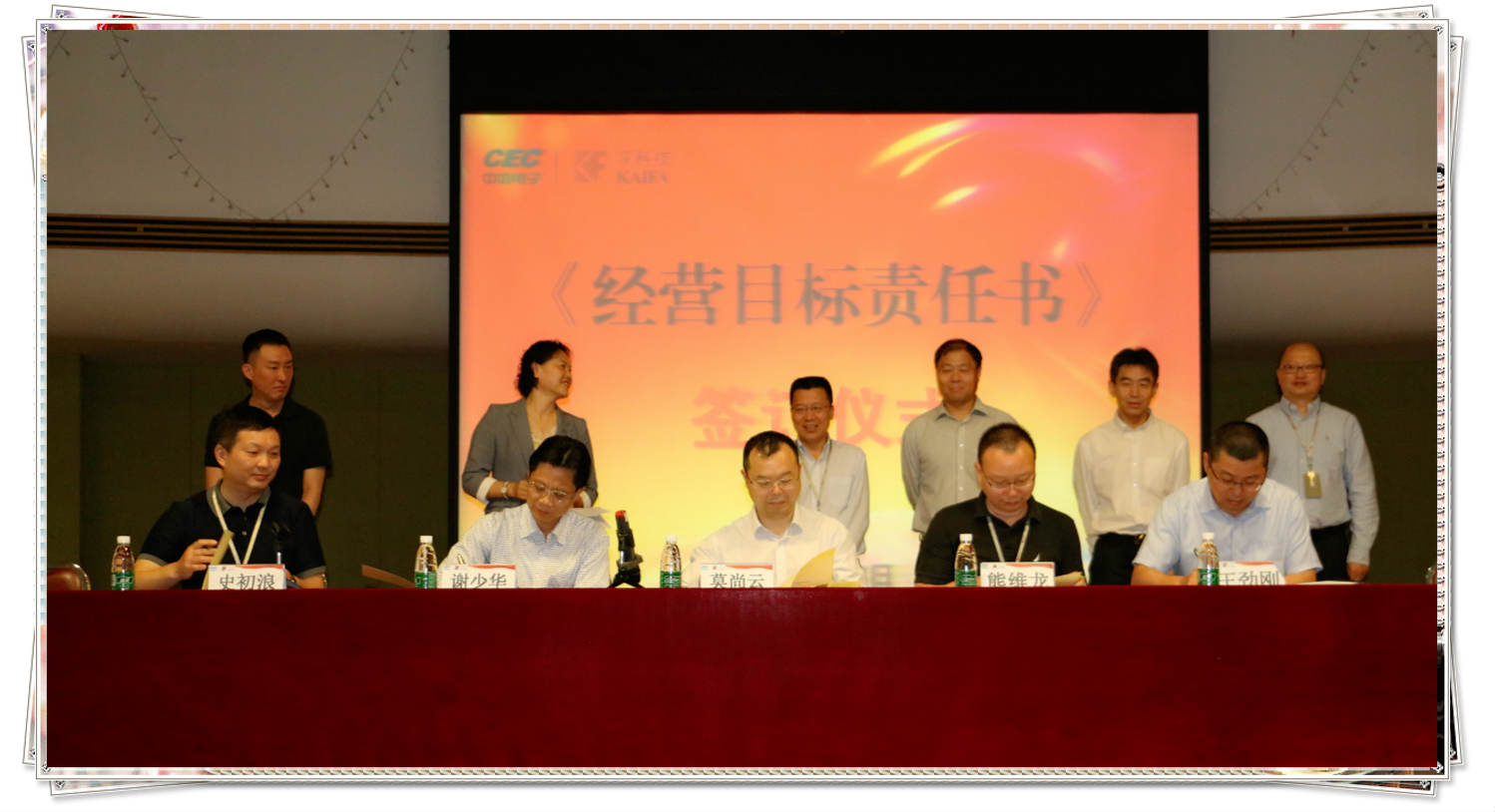 (↓ 莫总与开发苏州总经理史初浪、开发惠州总经理谢少华、开发东莞总经理王劲刚、关键零部件事业部总经理熊维龙签署经营目标责任书)