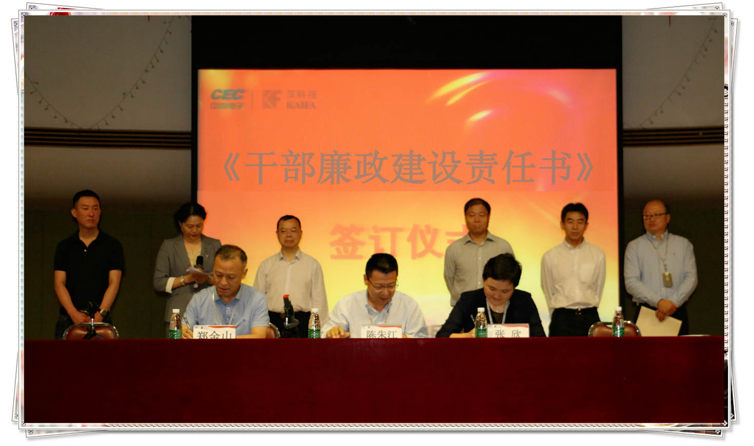 (↓ 公司党委书记、副总裁陈朱江与地产开发部负责人郑金山、采购部负责人张欣签署干部廉政建设责任书)